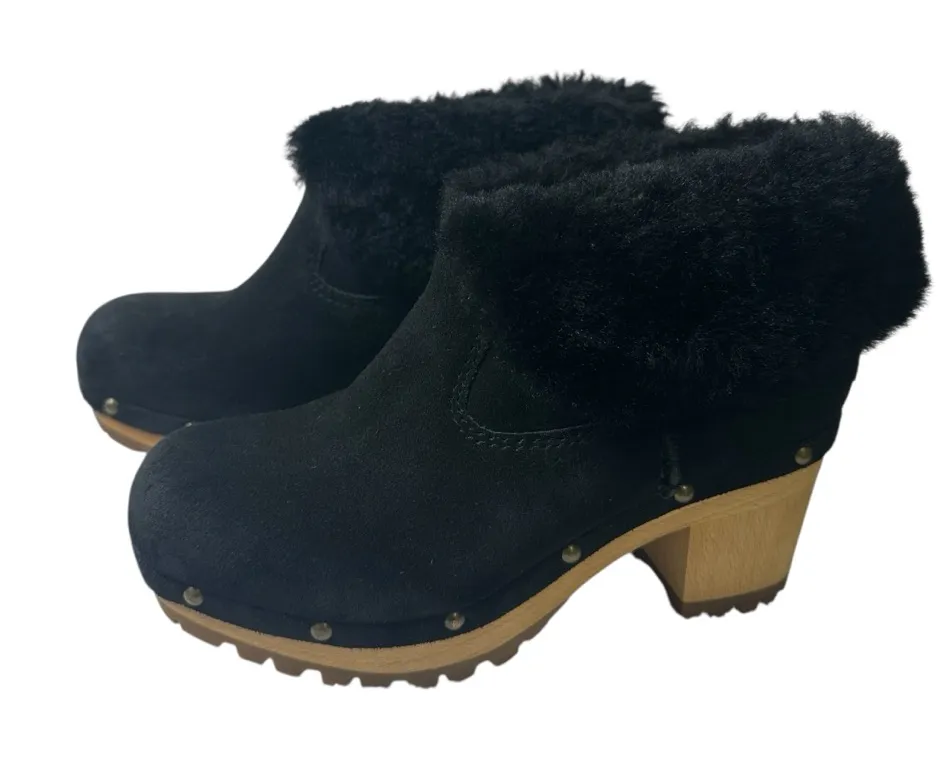 Stylish black mules featuring plush faux fur trim. Sturdy wooden heel. Ideal for everyday comfort.