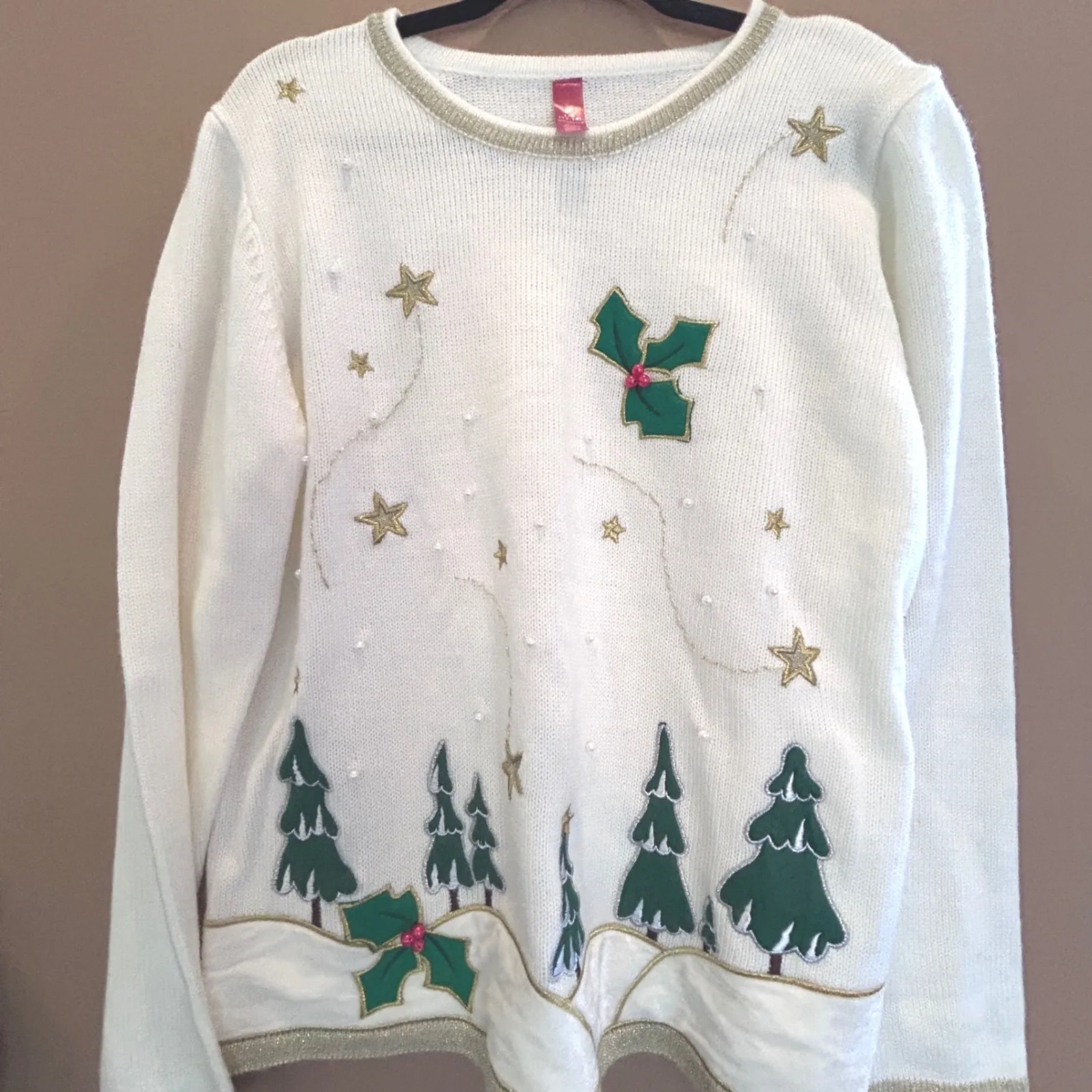 Excellent item with pearl and other decor. A festive white knit sweater adorned with a charming Christmas scene. Features embroidered green trees and holly leaves with red berry accents, sparkling gold stars, and delicate pearl-like beads scattered across the design. A metallic gold trim accents the neckline and hem for added sparkle. Perfect for holiday parties, casual gatherings, or embracing the spirit of the season. Style: Pullover Department: Women Material: 100% Acrylic Neckline: Crew Neck Theme: Christmas, Stars Sleeve Length: Long Sleeve Type: Sweater Features: Graphic Print Pattern: Solid Fabric Type: Knit Accents: Beaded, Embroidered Season: Winter Fit: Regular Occasion: Casual Garment Care: Machine Washable