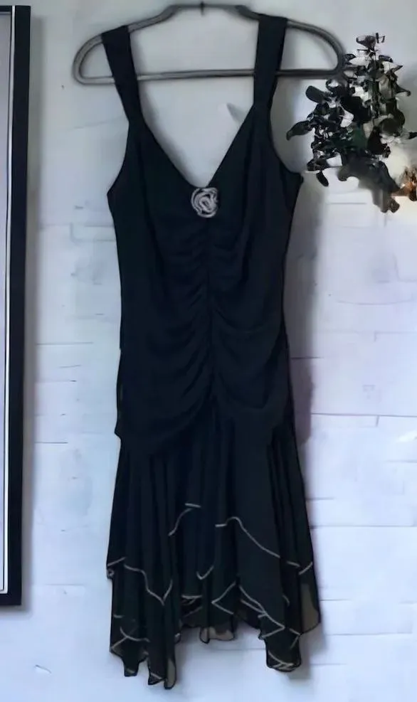 VINTAGE 1990s Goth Dress Ruched Ruffles Alt Y2K Black AGB Dress Size 10 Prom This 90s/Y2K dress is a vintage lover's dream! The dress features: Ruching Handkerchief Hem A Rosette Ruffles V Neckline Sizing: This is a vintage size 14, but fits like a modern size 10 (see measurements to confirm) Measurements~~ 19" Pit to pit 44" Length Excellent vintage condition, no flaws noted