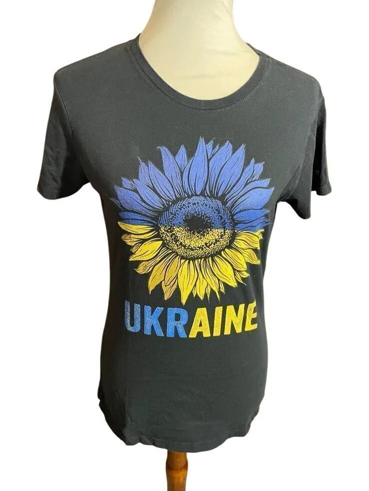 Ukraine Women’s Black Short Sleeve T-Shirt with Purple and Yellow Colors with Large Flower Size Small Features include: Crewneck Short Sleeve Size Small Black With Purple and Yellow Very Good Condition 100% Cotton Port Authority Approximate measurements: 16in armpit to armpit 24.5in length Runs true to size