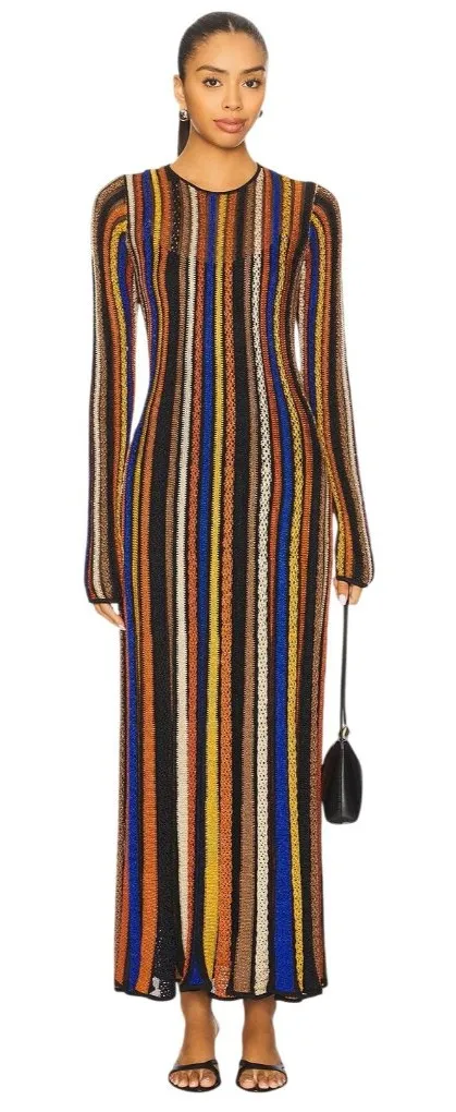 Ulla Johnson worked with Dutch textile artist Claudy Jongstra to create fabrics for the Fall '25 collection. Debuted on the runway, this 'Albie' maxi dress is knitted in a combination of open stitches for a rich texture and fitted profile that flares out at the hem. Complement the warm tones of the stripes with gold jewelry. 80% nylon, 20% viscose Dry clean only Unlined Pull-on styling Heavyweight knit fabric Garment is made with a semi-sheer fabric, undergarments can show through Manufacturer Style No. FA250725 Color: Zoisite MSRP:$790.00 Features: • Currently on Revolve for full price. Size: Womens S Measurements taken flat across, stretchy Bust 14 in / 36 cm Hips 16 in / 41 cm Length 54 in / 137 cm Condition: New With Tags Tags: night out, party, event, date night, sexy, bodycon, graduation, mini, cocktail, going out, bright colorful, fancy, wedding guest, sheath, brunch, bachelorette, simone, rush, sorority, designer, luxury, high end, runway, fall, merlot, wine, red, winter, holiday, xmas, christmas