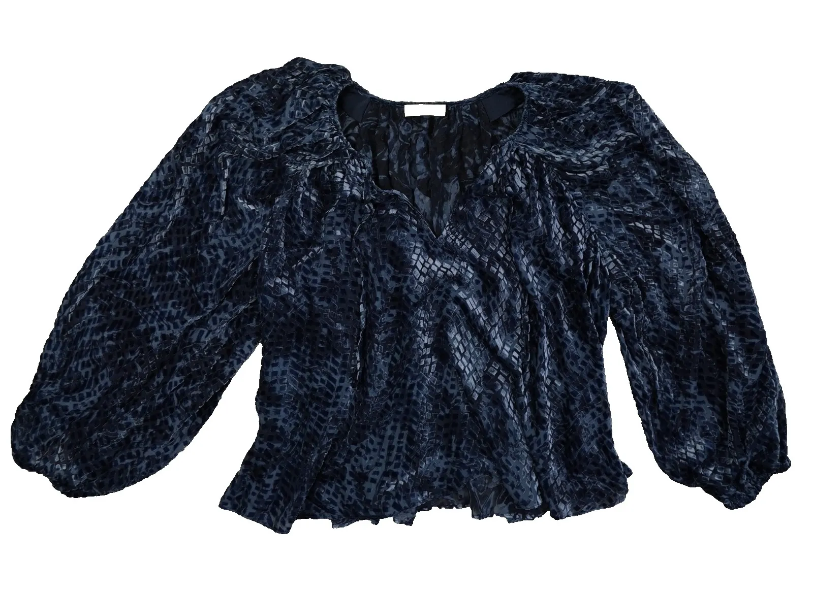 The Ulla Johnson Pauline Blouse in size 10 is a stylish and versatile top for women, featuring a geometric blue marine velvet pattern with a relaxed fit. This peasant boho chic blouse has long balloon sleeves and a V-neckline, making it perfect for casual occasions during the summer and spring seasons. Made from a lightweight and breathable silk and viscose blend, this pullover blouse by Ulla Johnson offers a designer touch with a bohemian flair.