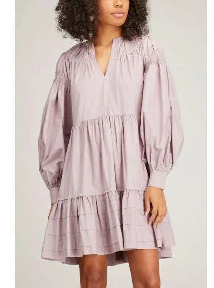 Excellent preowned condition, no flaws. Size: 2 Made of 100% cotton Stretch: none Care: dry clean Closure: pull over styling Style Notes: light purple gray color, mini lenght, tiered skirt, v neck, balloon sleeve, cotton, light weight, oversized fit Tags: ulla johnson, spring, fall, summer, mini, cotton, tiered, long sleeve