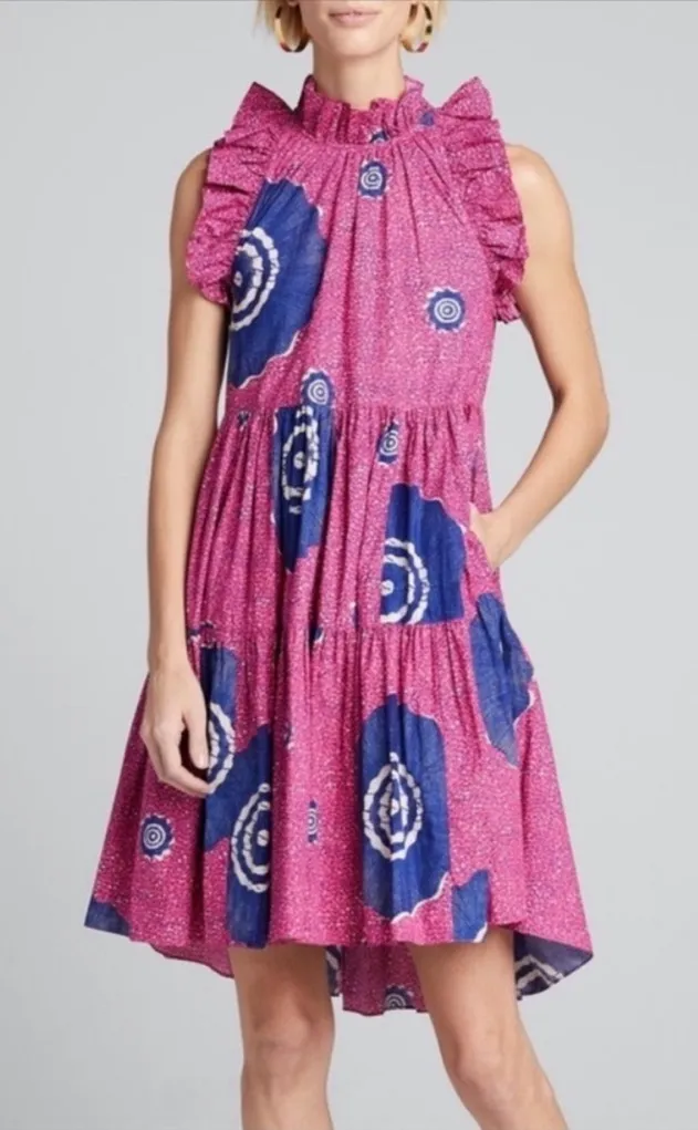 ULLA JOHNSON Tamsin Tiered Sleeveless Printed High-Low Dress Women's Size 6 in Pink and Blue The forever favorite Tamsin Dress returns in Ulla Johnson's signature cotton poplin, reimagined in a bold sand dollar print. This mini dress style features high ruffled neckline, a tiered skirt, and back button closure. Unlined. Made to fit oversized Measures approximately 37" from shoulder to hem. Pit to pit 18.5" Length back 39" 100% Cotton. Made in India. Excellent pre-owned condition, no flaws.