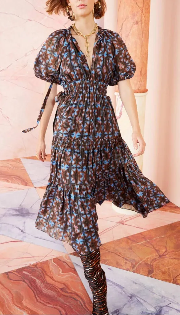 The Tunis Dress is an eye catching beauty crafted from our tie-dye Kaleidoscope printed silk chiffon adorned with delicate lurex stripe detailing. Midi length silhouette featuring a flowy tiered skirt, adjustable side-tie waistline, split neckline, and voluminous balloon sleeves. Lined. Composition: 96% Silk, 4% Lurex. Gorgeous and ready for its next adventure. Flatlay Measurements (approximate) Chest 20 inches Length 50 inches Sleeve from underarm 6 inches Waist 14 inches (elastic - stretches to 18 inches) Hip 24 inches