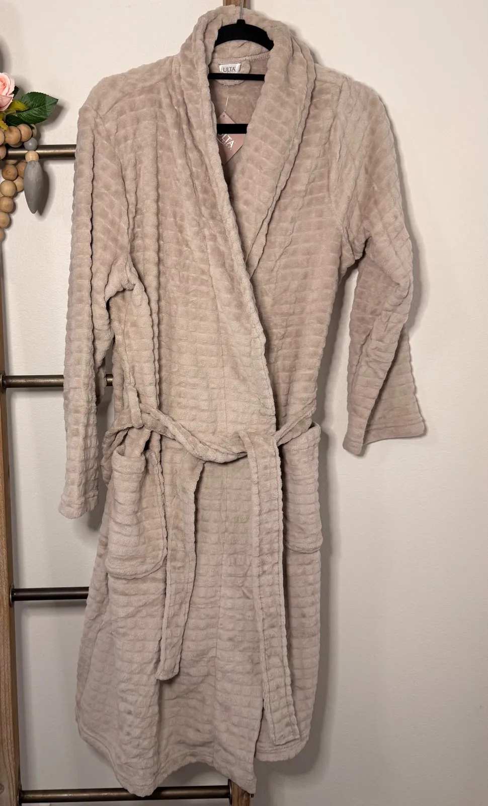 A luxuriously soft plush waffle knit robe. This cozy bathrobe features a classic wrap silhouette with a tie belt for a customizable fit. Dual front pockets offer convenient storage. Perfect for relaxing at home after a bath or enjoying a quiet morning. Keywords: plush robe, waffle knit, beige robe, cozy, loungewear, bathrobe, comfort, relaxation, oversized, gift idea, self care, luxe feel, winter wear Size Large X Large This item is in good pre owned condition *Thank you for shopping my closet *Same or Next Day Shipping *Smoke Free Home *Offers Welcomed