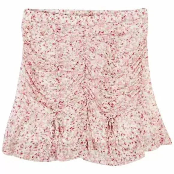 Ultra Flirt Juniors' Printed Ruched Mesh Skirt in Pink Size M NWT. No flaws. Details Sizes: Medium W: 13.25 L: 17.50 Garden Bouquet stock color Pull-on style Adjustable ruching at front Lined Rayon/spandex; lining: polyester Machine washable