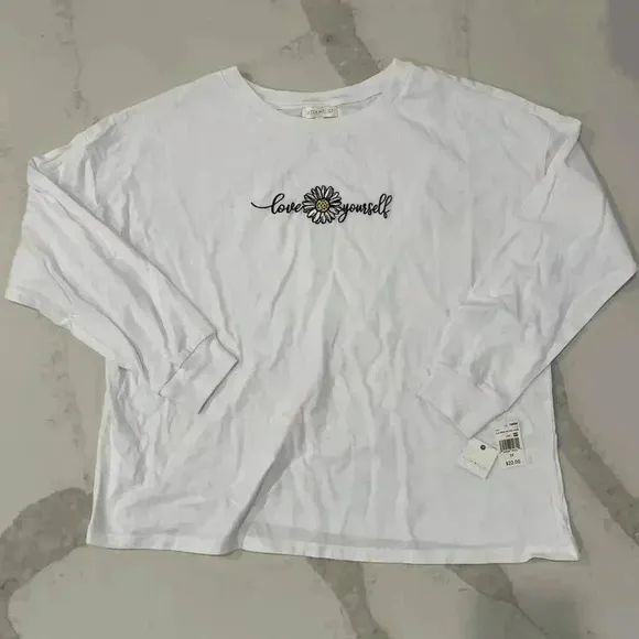 Ultra Flirt NWT White Long Sleeve “Love Yourself” Daisy Casual Shirt Women’s Size 1X Inspriational - School - Everyday New! Would make a great Christmas gift! #ultraflirt #nwt #gift #christmas #daisy #flowers #loveyourself #casual #basic #everyday #school #relaxation #inspirational
