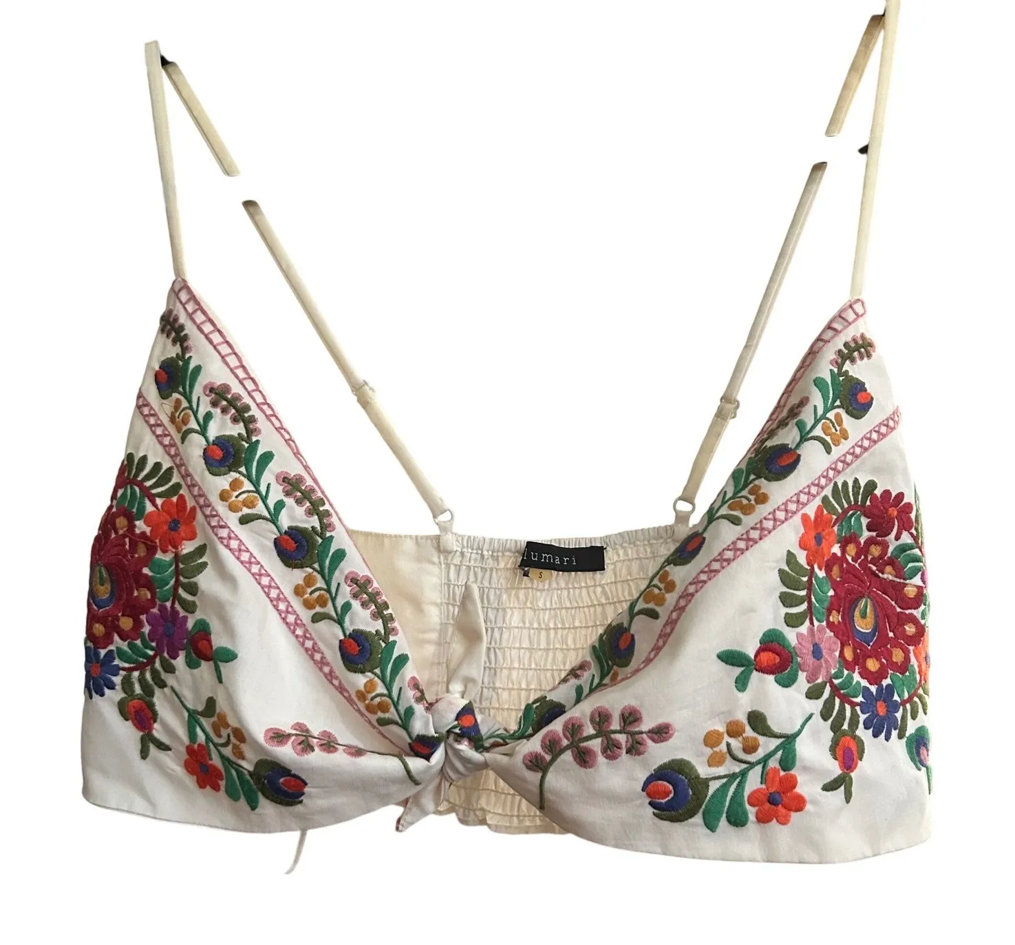 Great condition but just some slight color discoloration on the white straps but can easily be cleaned with stain remover and bleach. Eye-catching cami top featuring intricate floral embroidery. This sleeveless crop top showcases a tie-front design, adding a touch of bohemian flair to your wardrobe. The smocked back ensures a comfortable and flattering fit. Perfect for summer festivals, casual outings, or adding a pop of color to your everyday style. Ask for measurements!