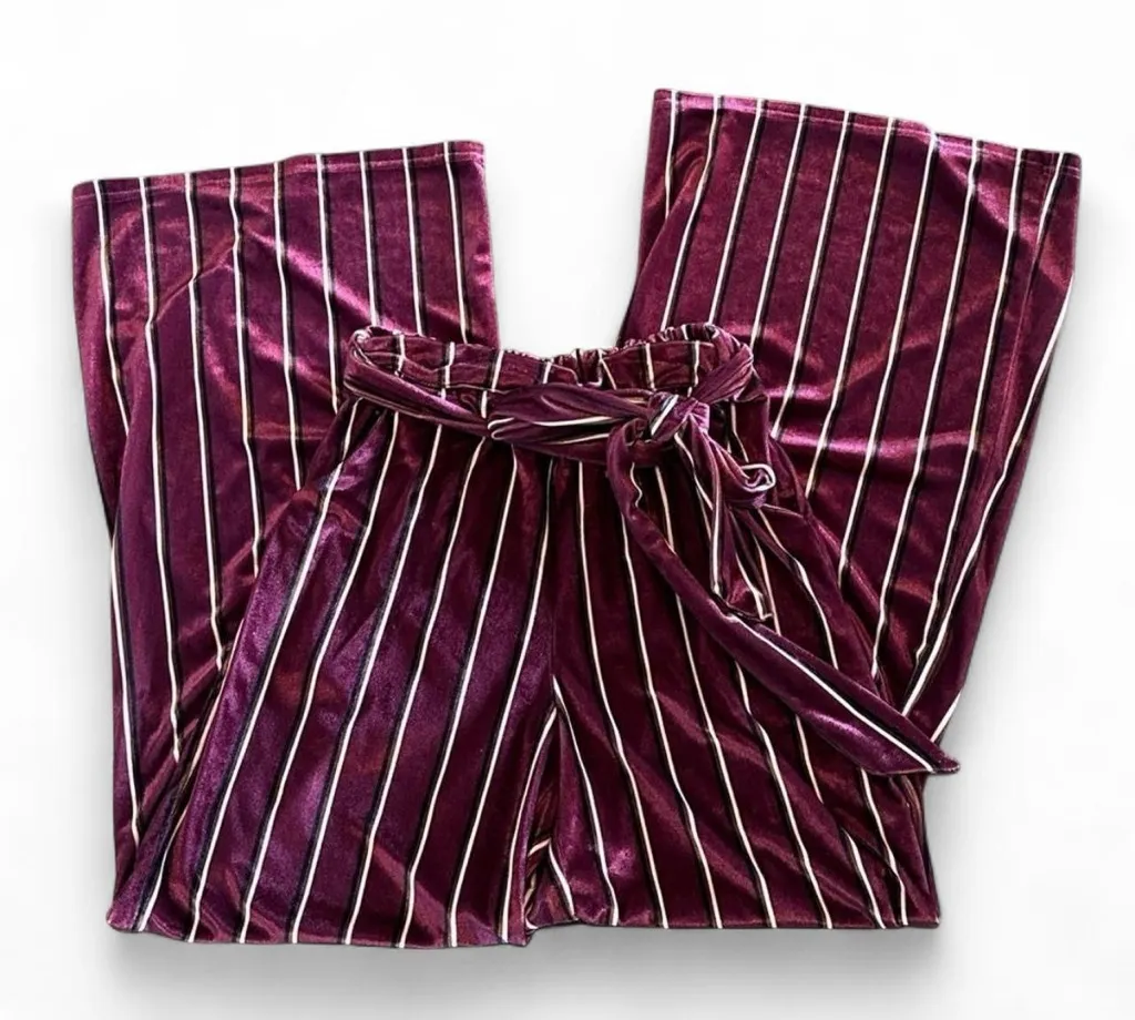 Umgee Burgundy Striped Velour Wide Leg Pants Size Small Great pre owned condition. Adjustable tie... Show more