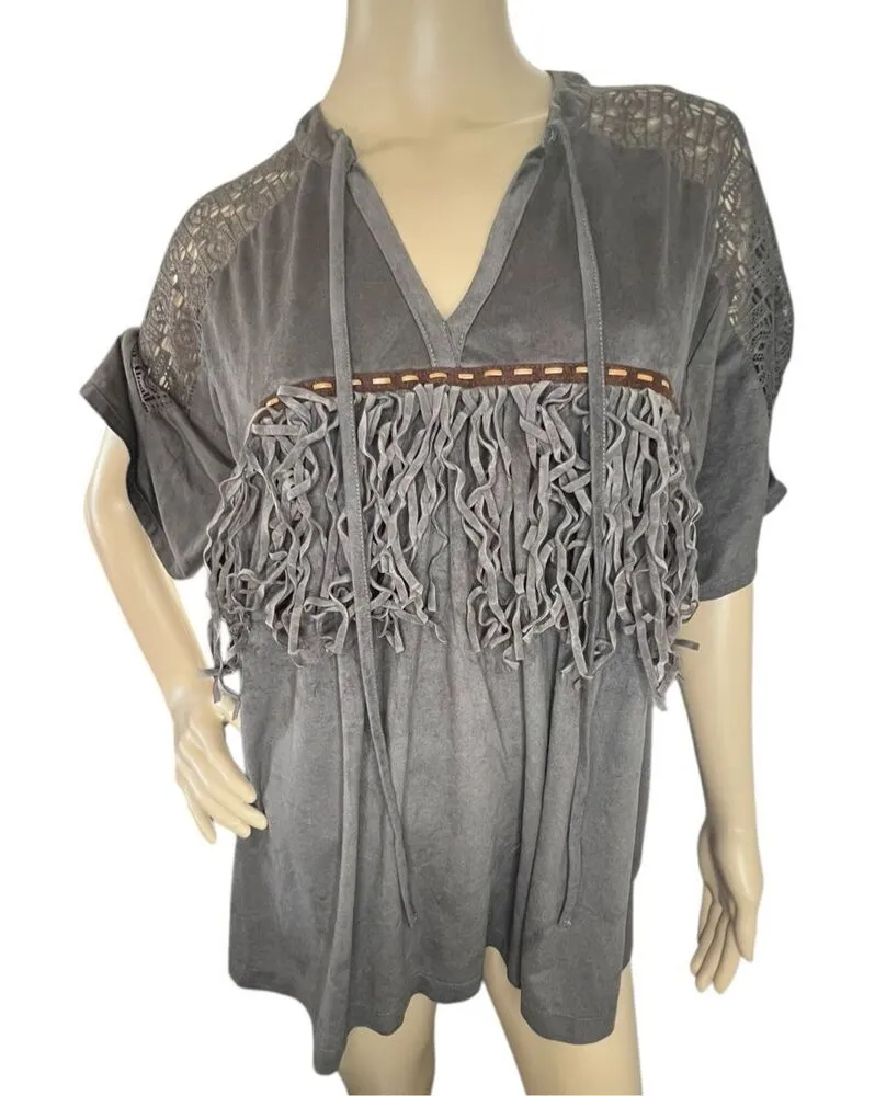 All orders ship within 1-3 business days! Umgee Faux Suede Western Boho Short Sleeve Top With Fring... Show more