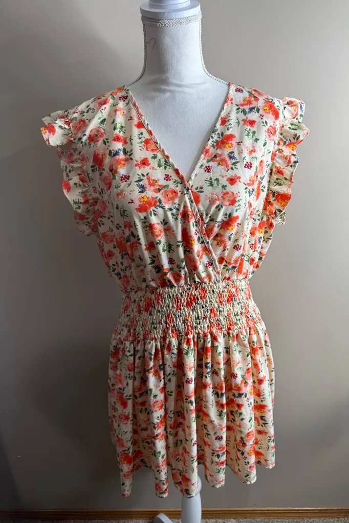 Chic floral dress with ruffle sleeves. Smocked waist for a flattering fit. Ideal for casual outings.... Show more