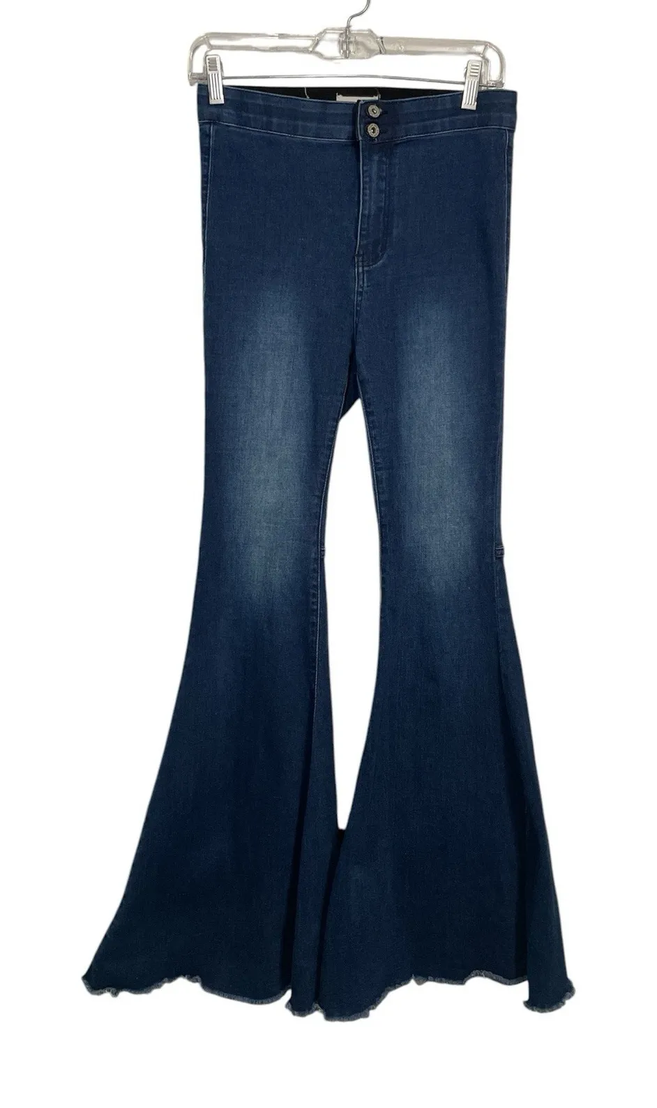 Umgee Bell Bottom Flare Leg Jeans Juniors Size 6 Light Wash Distressed Raw Hem Measurements laying... Show more