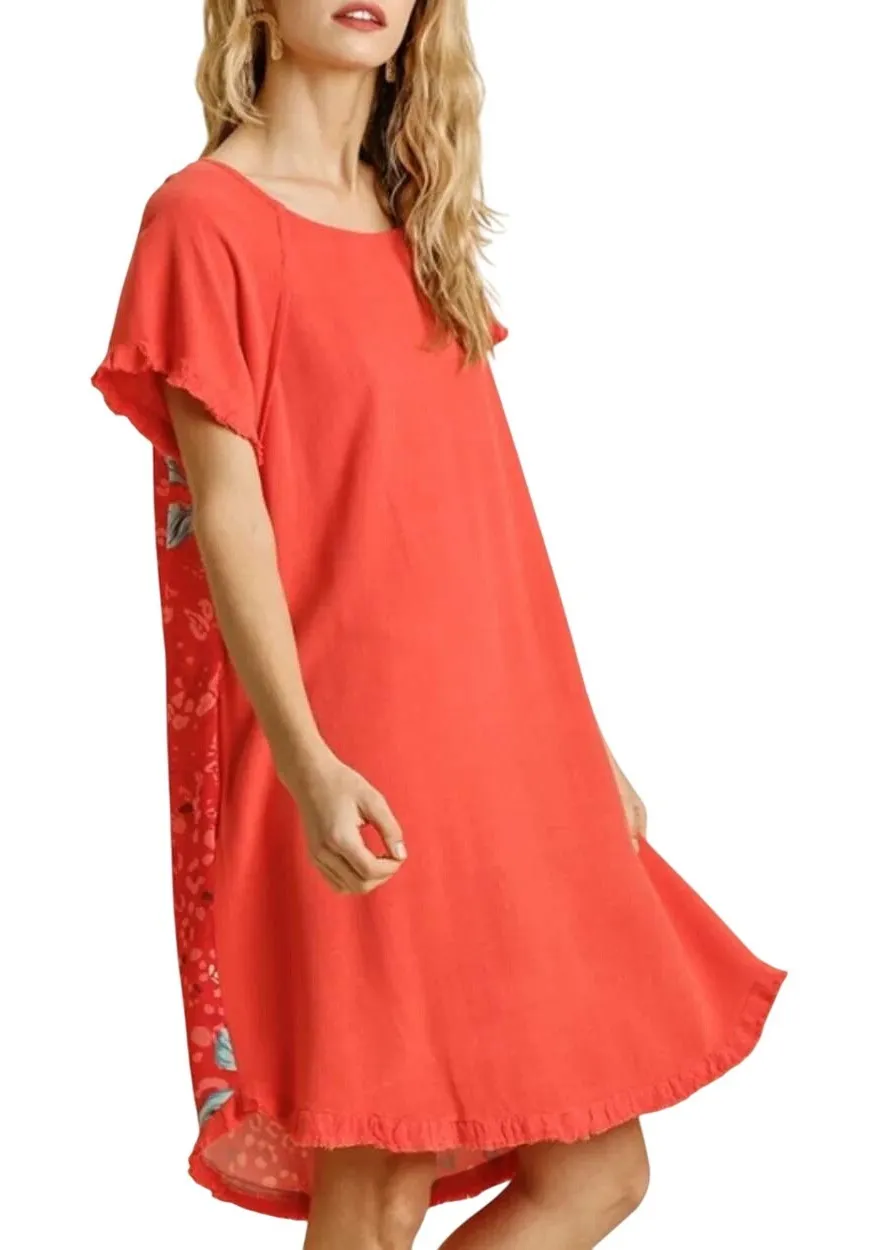- Umgee Linen Blend Short Sleeve Dress - Coral with Floral Animal Print Back - 55% linen/45% cotton... Show more