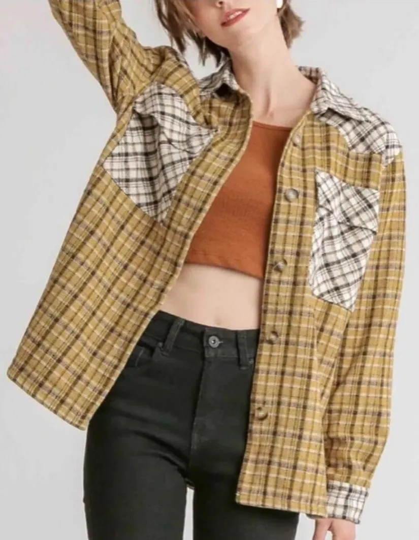 Umgee Mustard Yellow Plaid Block Patch Pockets Flannel Shirt Shacket Mustard Plaid Mix Block Patch... Show more