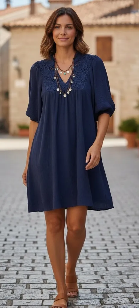 Effortless boho style by Umgee. This navy blue mini dress features a flattering ruffle stand collar... Show more