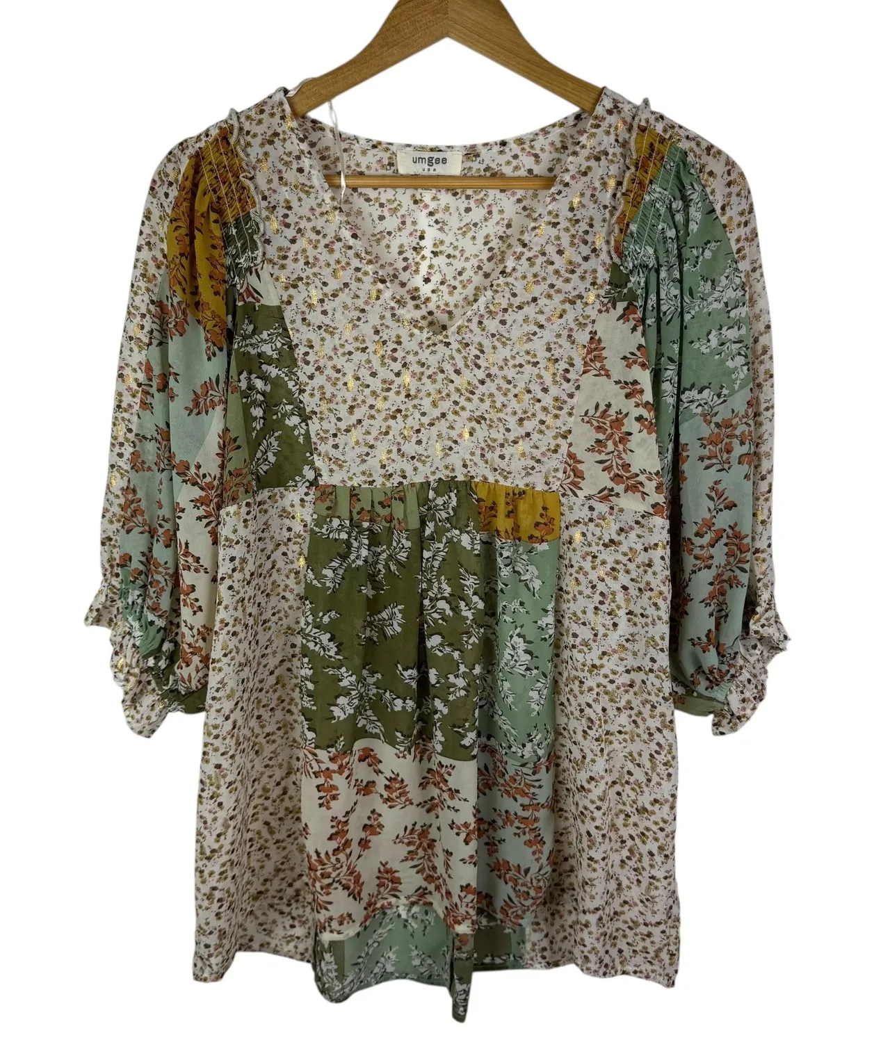 Umgee USA patchwork floral print blouse with gold metallic accents. This charming top features a V-n... Show more