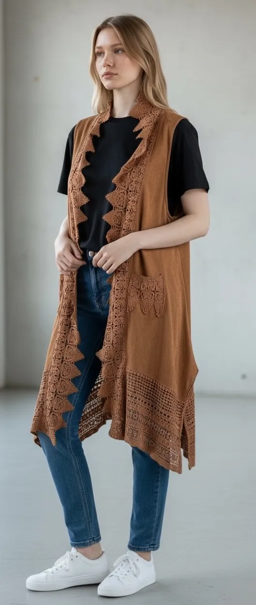 Umgee USA long crochet lace trim vest duster in brown. This sleeveless open-front layering piece features intricate lace detailing along the neckline, down the front opening, and at the hem. Two functional front pockets add practicality. Perfect for adding a boho touch to your everyday outfits or for a stylish festival look. Measurements: • Shoulder to Shoulder: 15 in • Pit to Pit: 20 in • Length (longest point): 37 in • Length (shortest point): 32 in Type: Vest Outer Shell Material: Suede Style: Kimono Department: Women Theme: Bohemian, Hippie Accents: Lace, Embroidered Features: Pockets, Open Fabric Type: Lace Pattern: Solid Season: Spring, Fall Occasion: Casual Sleeve Length: Sleeveless Fit: Relaxed Country of Origin: China Unit Type: Unit Keywords: Umgee, boho vest, crochet vest, lace trim, duster vest, long vest, open front, pockets, festival wear, layering piece, bohemian style, suede feel, women's vest
