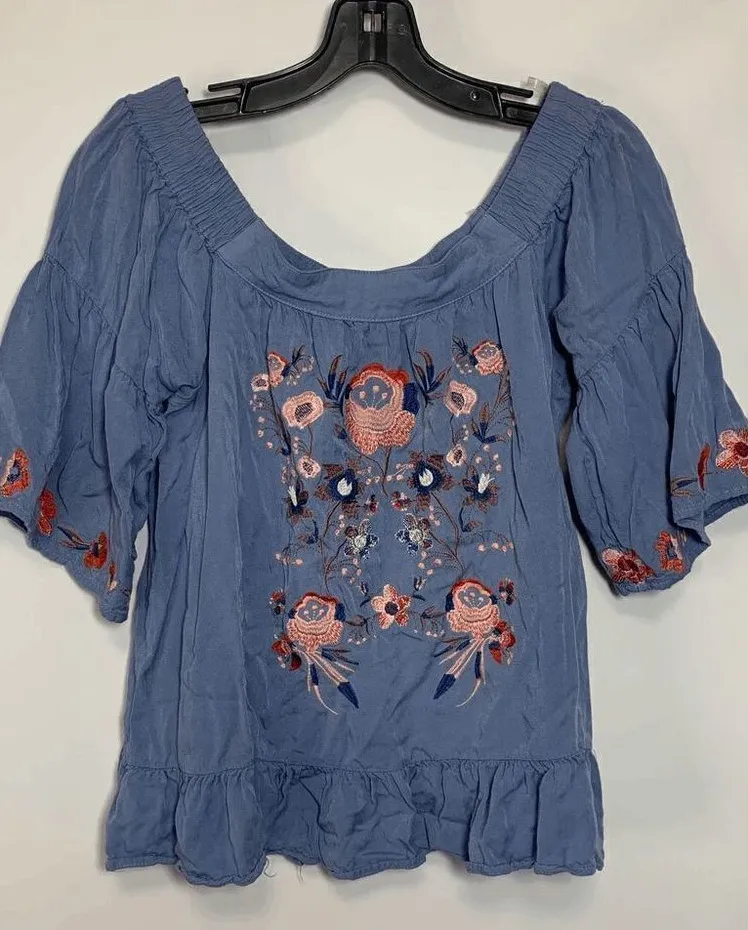 Umgee Women's Off the Shoulder Floral Embroidered Short Sleeve Denim Blue Top Size S Awaken your in... Show more