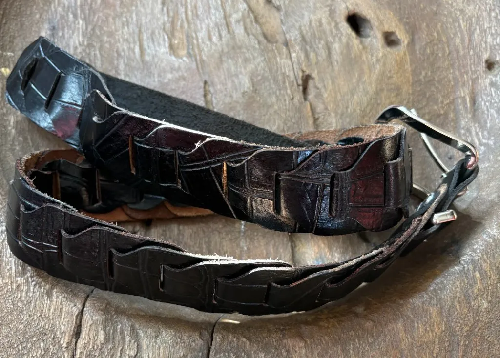 Black belt with silver-tone hardware. No tags. Likely synthetic/vegan leather. Overall, belt measures 38 inches. It ranges from 33 to 34 to the two holes, and it's 1.5 inches wide. In terrific condition with a cool interwoven design.