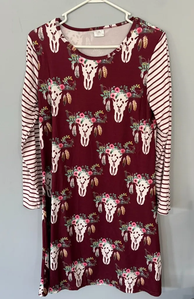 Unbranded Floral Cow Skull Print Dress w/ Striped Long Sleeves in Women’s Size XL. Dress is in good used condition with no flaws or stains other than some minor wash wear. Soft cotton & spandex blend. Please see close-up pictures for condition details. Western, country, rancher, cowgirl, cowboy, west, concert. Modest neckline, short dress length. Offers welcome. Fast shipping.