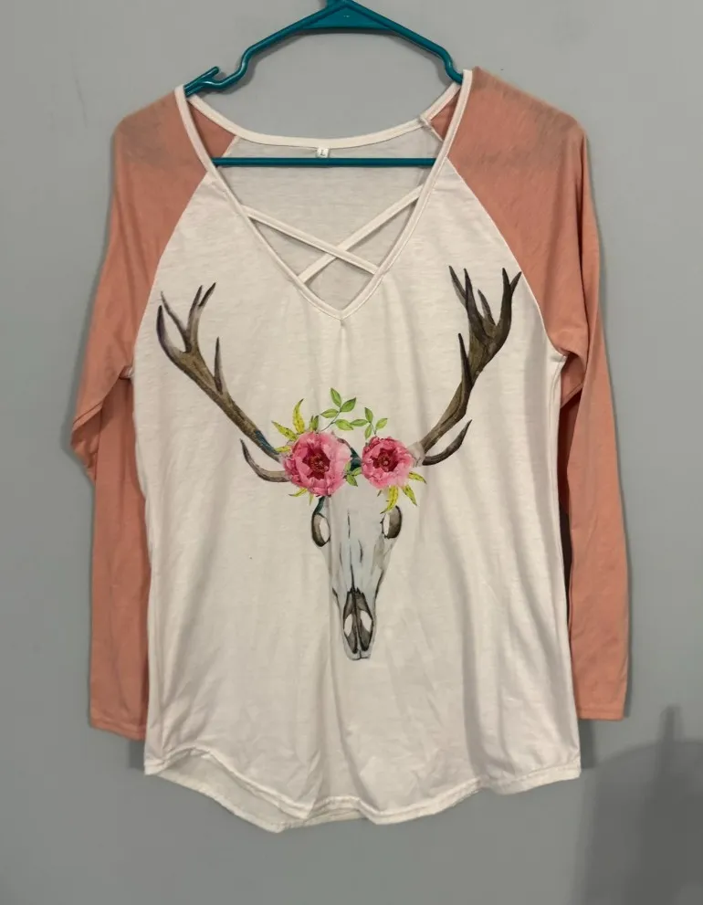 Unbranded Floral Deer Skull Raglan Top in Women's Size Large. Crisscross V-Neck, cotton & polyester blend, baseball style top with 3/4 sleeves, lightweight. Top is in good used condition with no flaws or stains other than some minor wash wear. Please see close-up pictures for condition details. Offers welcome. Fast shipping.