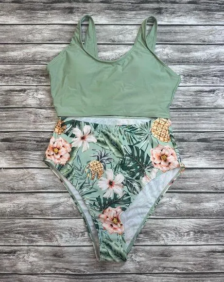 Unbranded Women's One Piece Bathing Swim Suit Full Coverage Colorblock Color Block Solid Color Bust Tropical Pineapple Hibiscus Palm Fran Print Bottom Fully Lined Removable Pads Molded Cups Quick-Dry Fabric High-Cut Bikini Bottom Cutout Cut Out Stomach Athletic Sport Swim Beach Pool Lake Boat Summer Color: Light Sage Green with Yellow, Peach, White Size: S SM Small Brand New without Tags - NWOT - Unworn Condition Comes from a smoke free home 85% Polyester 15% Elastane Measurements in pics- let me know if you need more True colors may vary due to lighting or monitor/screen settings Offers welcome, no trades Same or next day shipping excluding Holidays