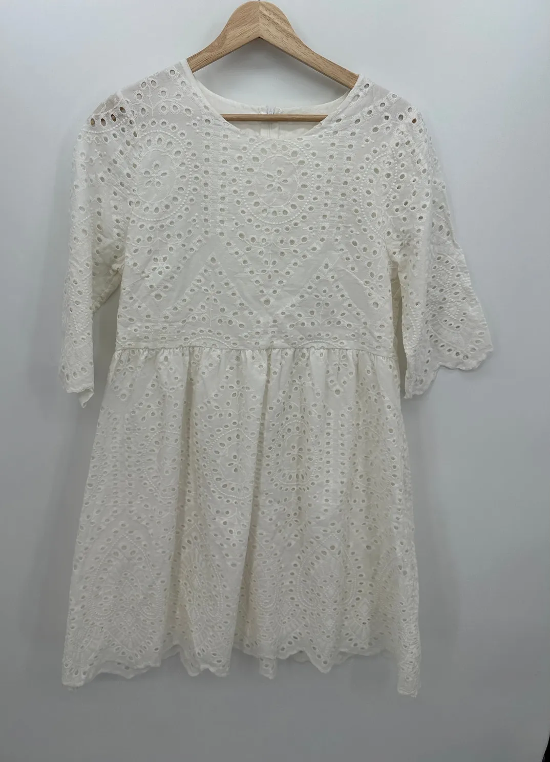 Unbranded Womens White Eyelet Dress Size L Modest Party 1/2 Sleeve Coquette Size: No size tag. Measuring Medium to Large Condition: Pre-owned. Good Condition. No rips, tears, stains. Please see photos for more details and measurements. Thanks!! # CY27 Features:
