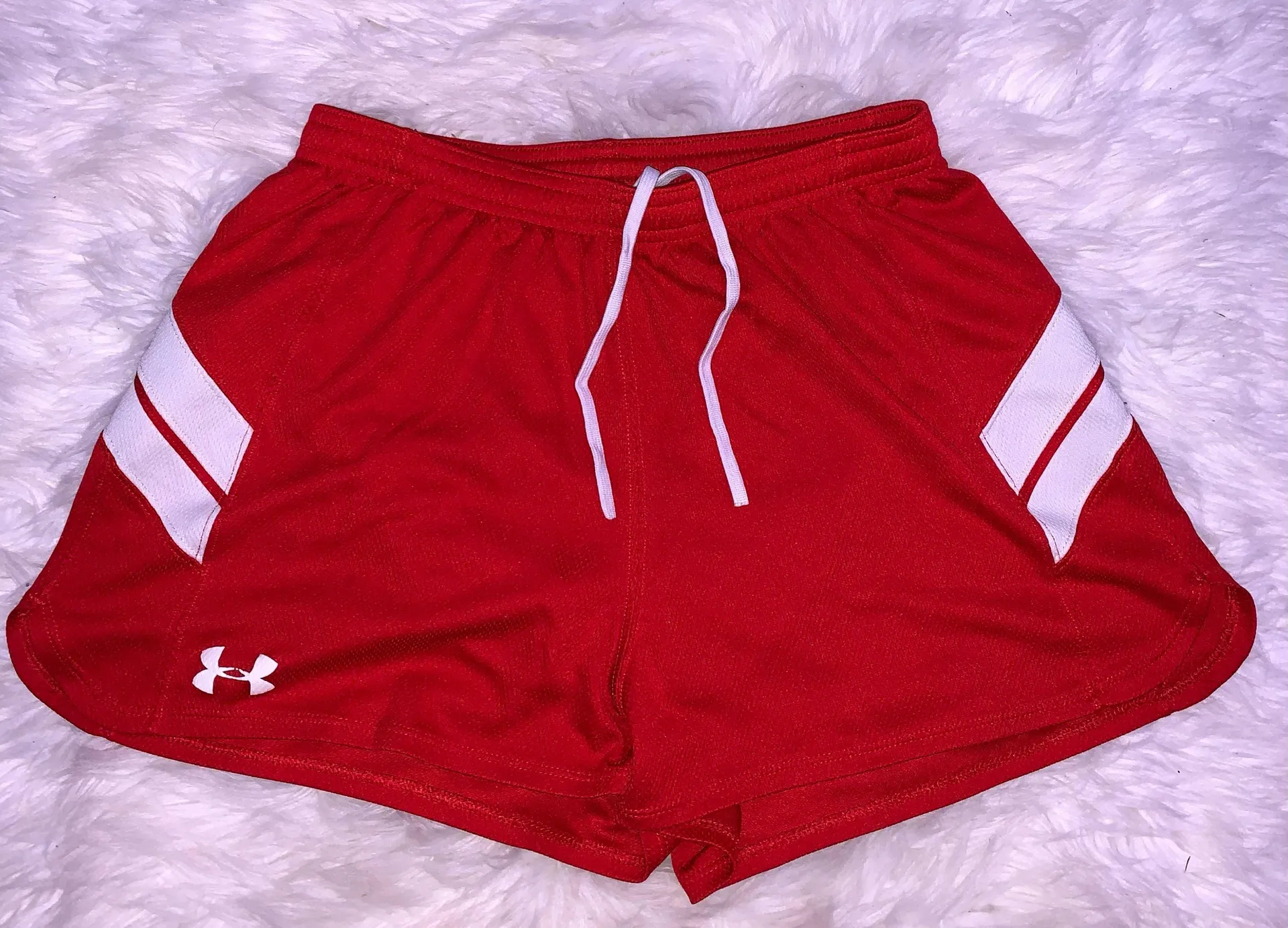 Under Armour red athletic shorts, has white underwear lining inside **sorry but no offers, already... Show more