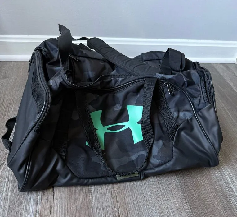 Sleek Under Armour duffel bag. Black with bold green logo. Ideal for gym or travel. Good pre loved... Show more