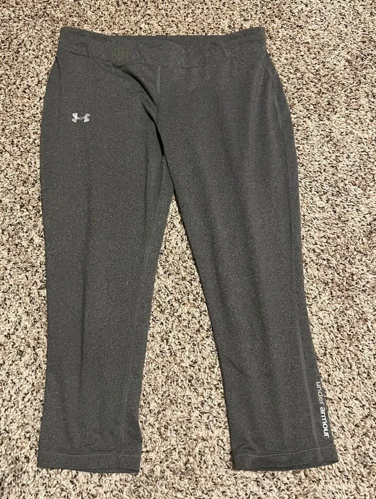 Versatile Under Armour cropped leggings in a classic charcoal gray. Features moisture-wicking HeatGe... Show more