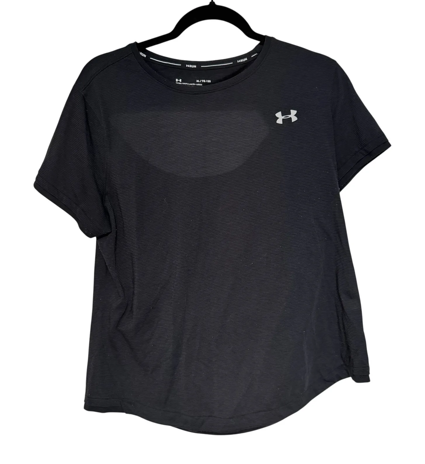 Keywords: Under Armour, HeatGear, athletic top, running shirt, workout shirt, black top, short sleeve, womens shirt, XL, extra large, striped, performance, activewear, gym top, fitness apparel