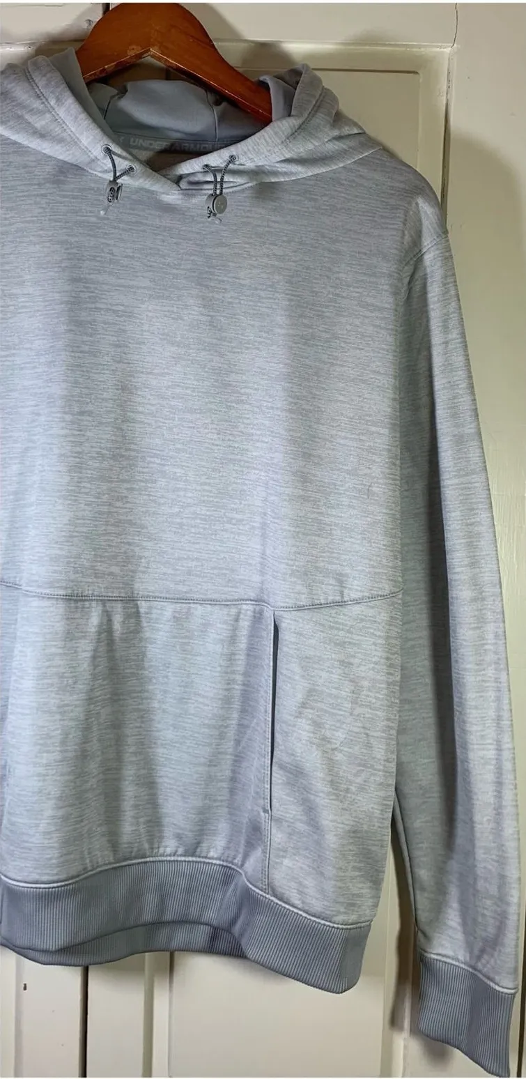 A heathered gray Under Armour hoodie designed for a loose fit. This pullover features a front kangar... Show more