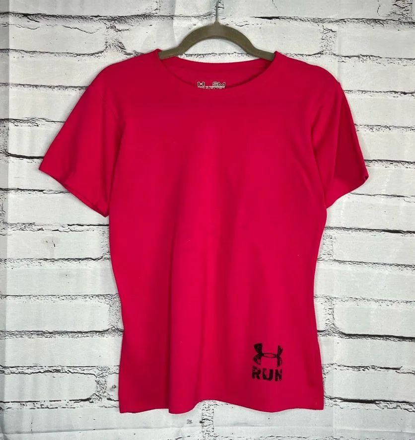 Under Armour HeatGear athletic tee in size S/M, featuring vibrant magenta-pink with “Rain Sleet Snow... Show more