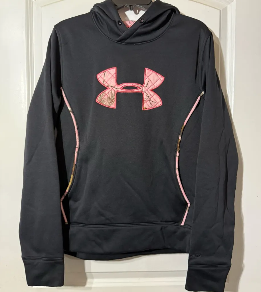 Stylish Under Armour top. Features pink and black colors. Semi-fitted design.