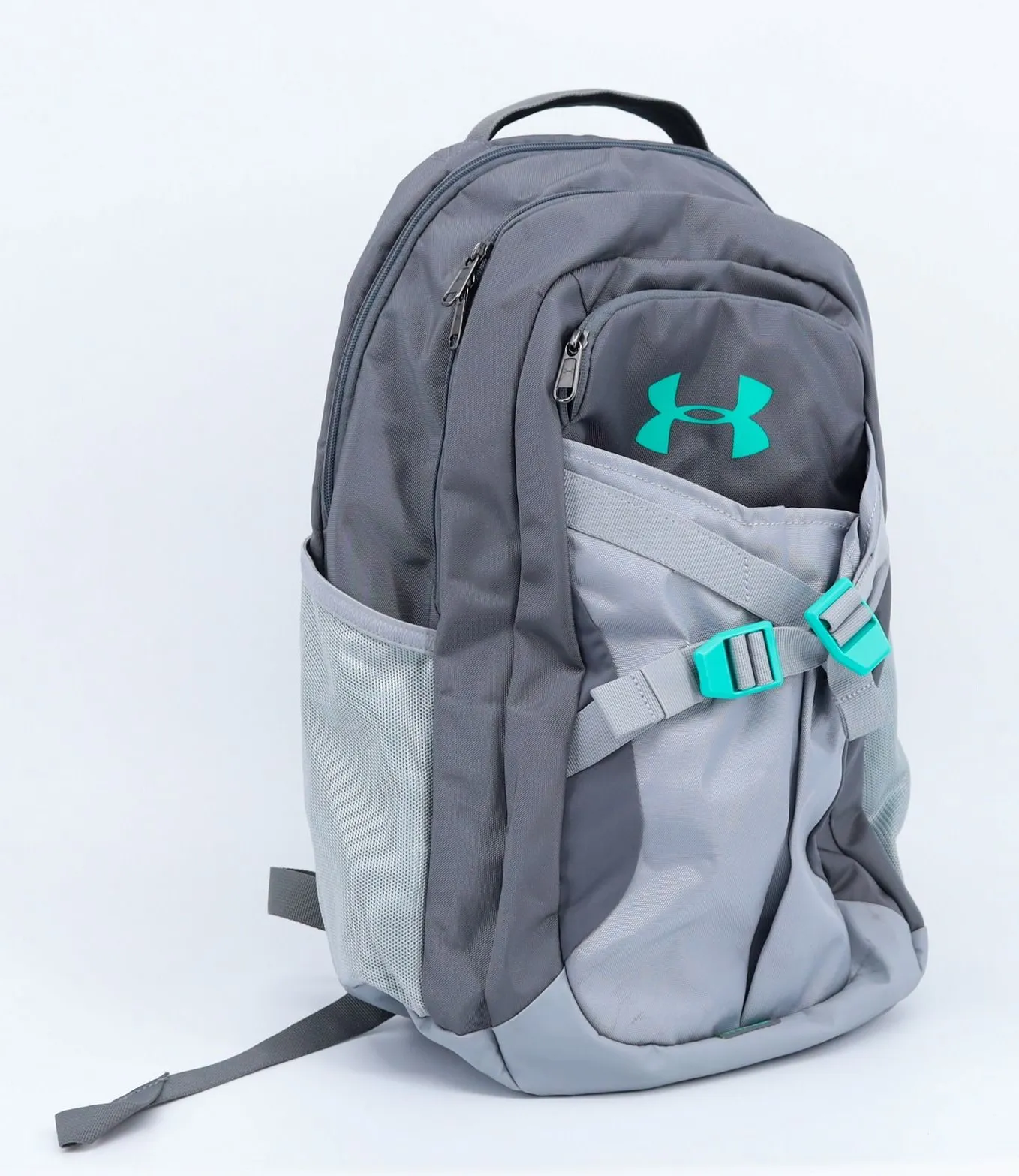 Under Armour gray backpack with teal accents. Features a prominent teal Under Armour logo on the fro... Show more
