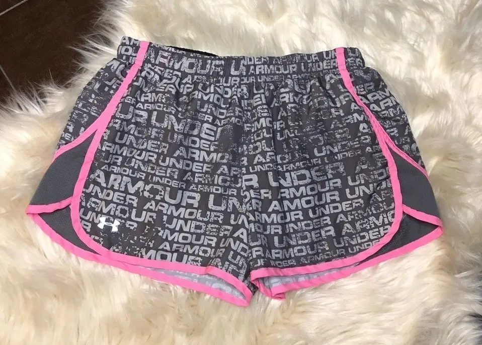 Under Armour Semi fit Heat gear Grey/pink trimmed Running shorts with elastic liner Drawstring S... Show more