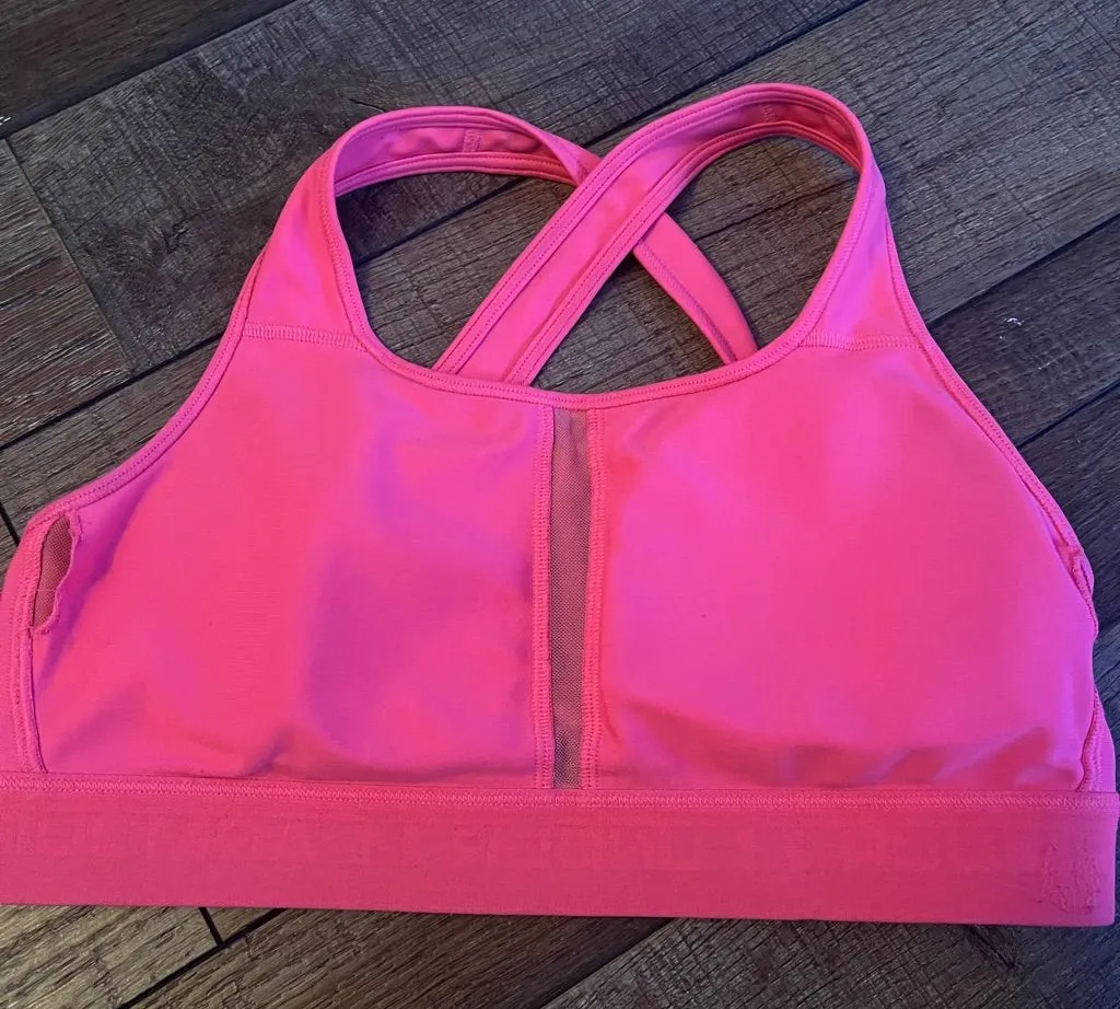 Bold pink sports bra with cross-back straps. Ideal for active wear. Provides excellent support.