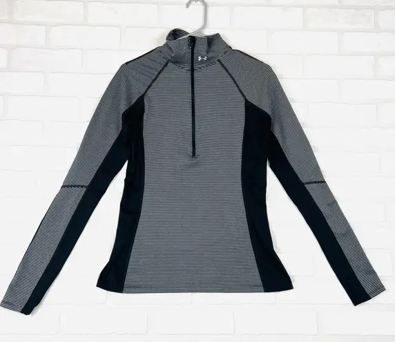 Keywords: Under Armour, athletic top, pullover, long sleeve, 1/2 zip, striped, workout top, running top, gym top, activewear, women's top, fitness apparel, black and gray, performance wear