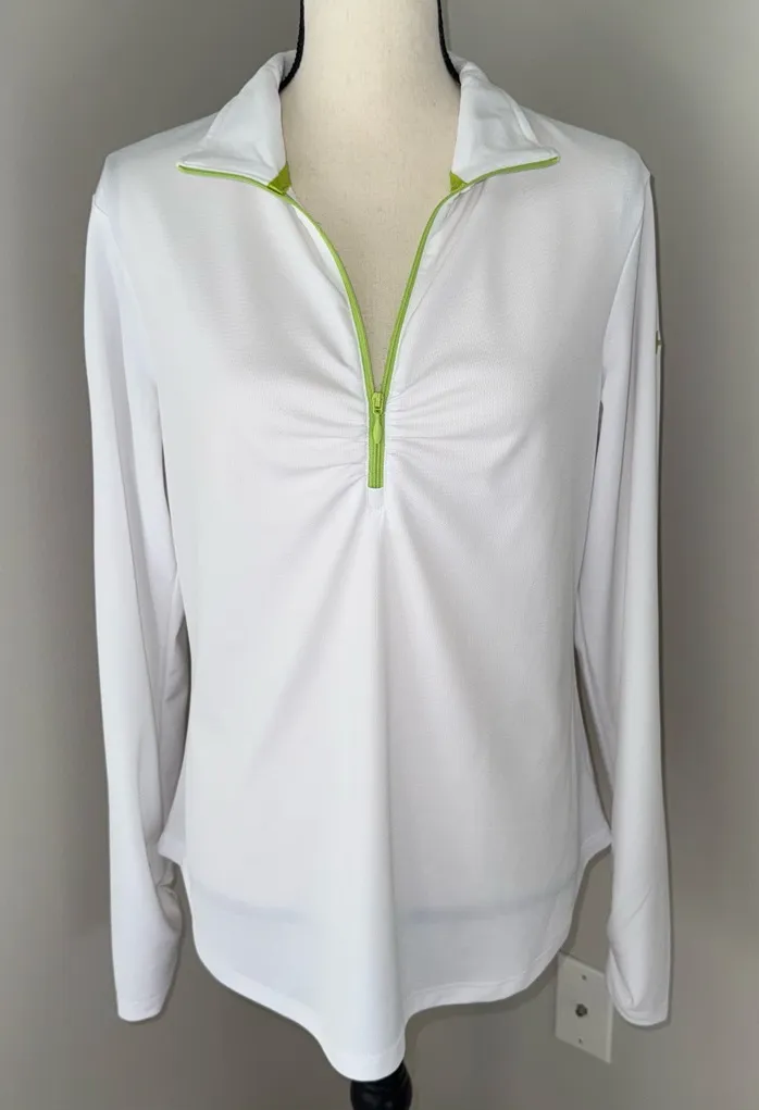 Like New Under Armour LOOSE heatgear long sleeve top. White with lime green zipper and logo. Rouchin... Show more