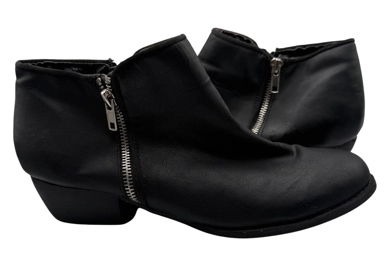 Womens black faux leather ankle boots with a side zipper detail. These boots feature a low wedge hee... Show more