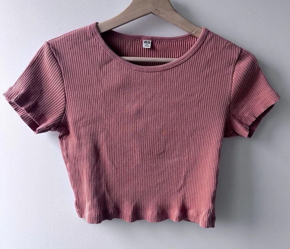 Uniqlo Pink Ribbed Crop Top XS Salmon T-Shirt Minimalist Y2K monochrome coral 90s Uniqlo Salmon Ribb... Show more