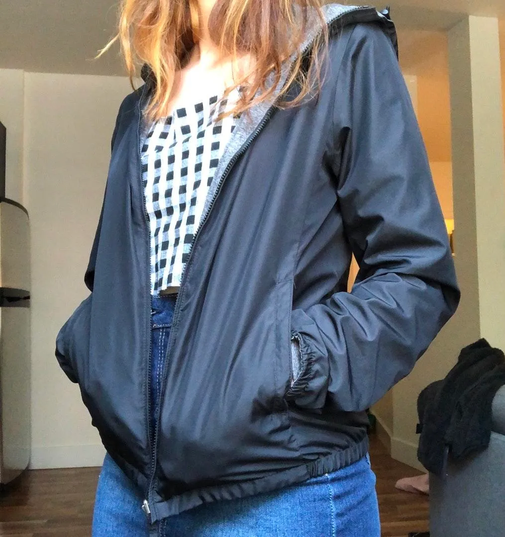 Black and gray reversible parka from Uniqlo! Perfect for a rainy day or when you need a jacket that... Show more