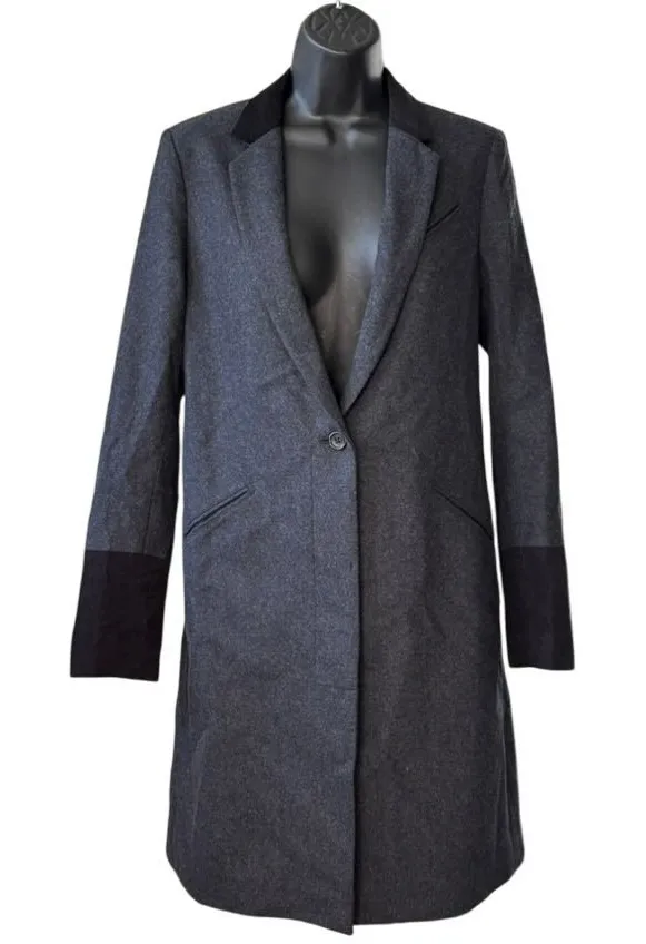 Uniqlo X Undercover by Jun Takahashi Single Breasted Long Wool Coat Size Small Dark gray with black corduroy cuffs and collar Bottom button is cracked, but it doesn't show when buttoned, and it stays fastened without a problem