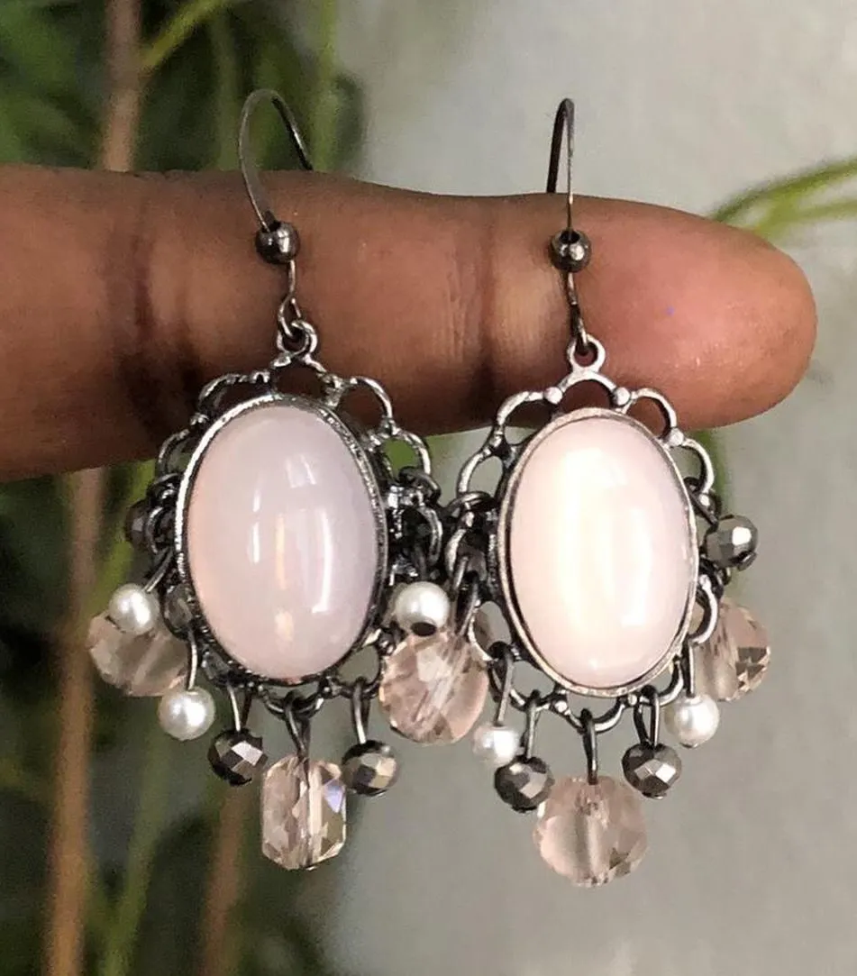 Unique Rose Pink oval crystal pearl glamour drop dangle earrings silver tone #boho #whimsygoth #coquette #twee #glam - $23 - From Victoria
