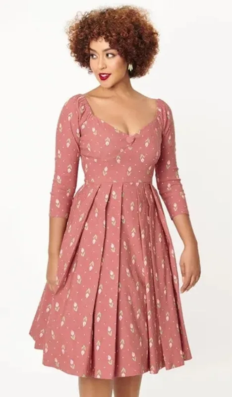 Unique Vintage Rose Pink Tulip Print Lamar Swing Dress Size 4X There is a few small snags near the hem, as pictured. Otherwise excellent condition! Cotton/Nylon/Spandex 3/4 sleeves Sweetheart neckline Pleated skirt Pink/rose tulip print Smoke-free home. No trades, offers welcome! 25x23x48.5