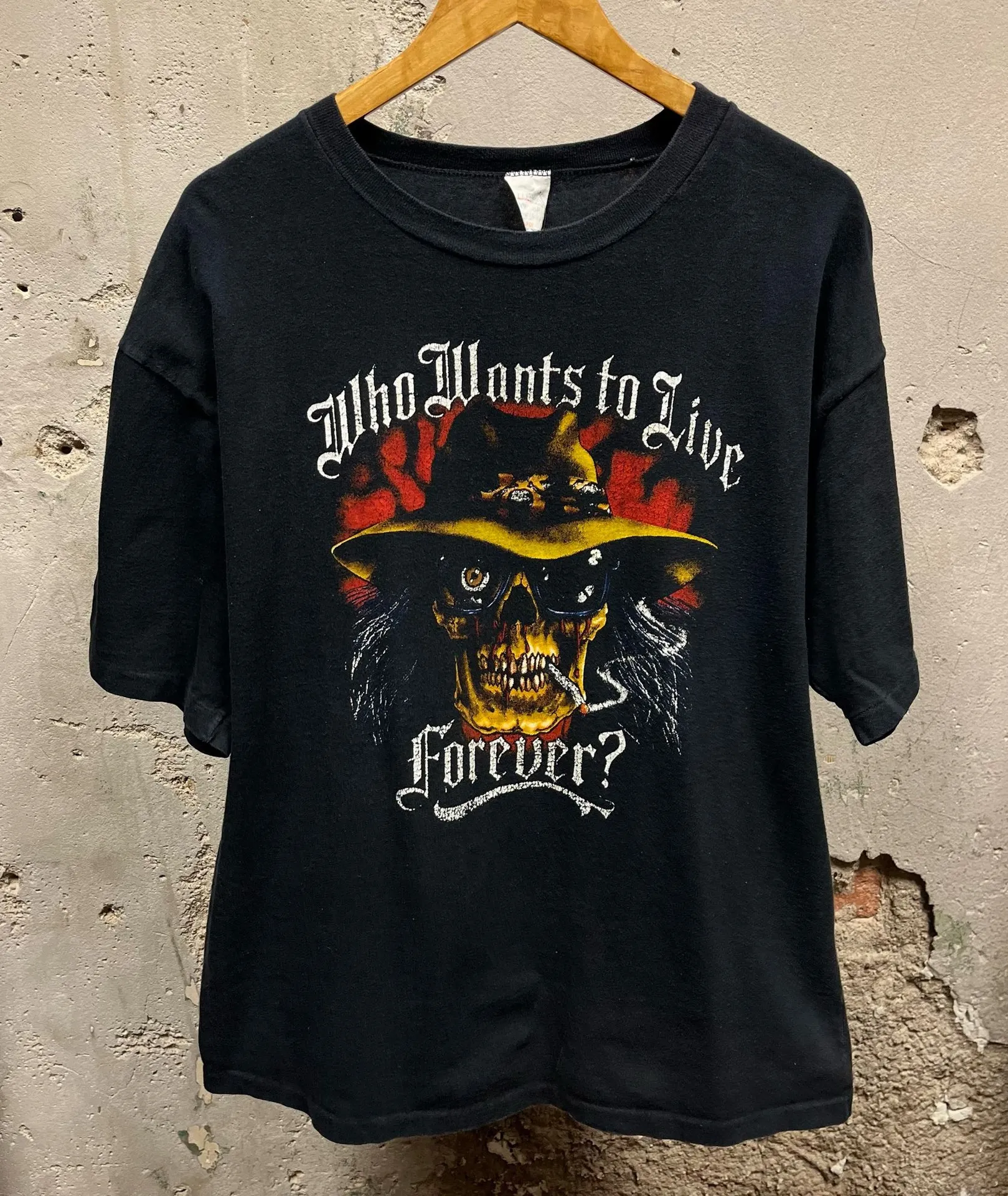 In good condition! Single stitch tee. Unisex cut. 3D Emblem skeleton graphic on the front. Has some... Show more