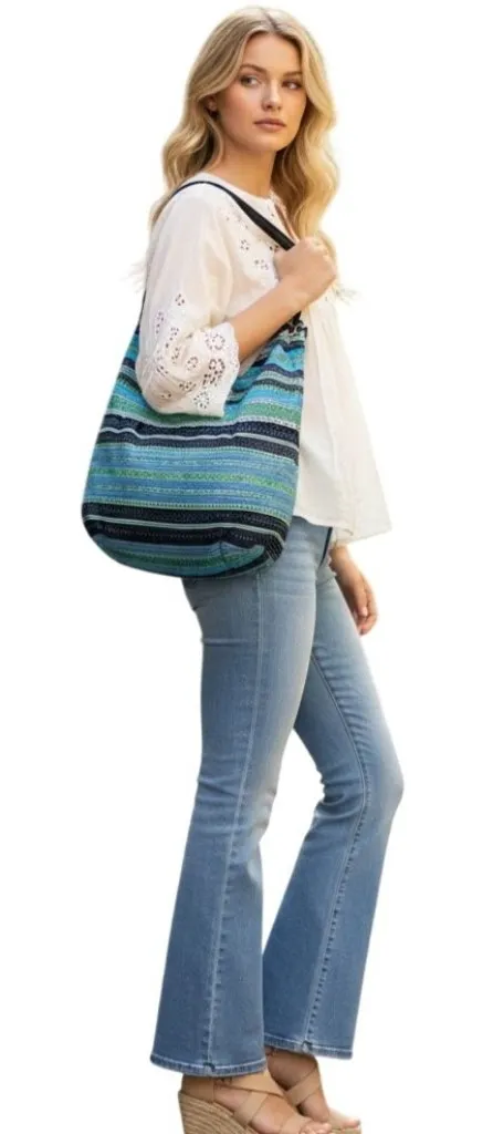 This bag is like a magician's hat; it can pull out just about anything—keys, snacks, or existential dread. Its vibrant geometric pattern ensures you'll never lose it in the sea of boring bags. With sturdy straps and a secure zipper, it’s ready for your adventures, big or small. • Zipper closure for security • Dual black shoulder straps • Boho-inspired geometric patterns • Spacious interior • Durable material Width: 12” Height: 9” lowest point, 14” highest Straps: 20” Please note the model picture is meant to be an example illustration and not an exact representation. boho, bohemian, cottagecore, hippie, peach, astrological, mystical, groovy, Festival, concert, funky, art to wear, artsy, colorful, art teacher, creative, artisanal, artisan,
