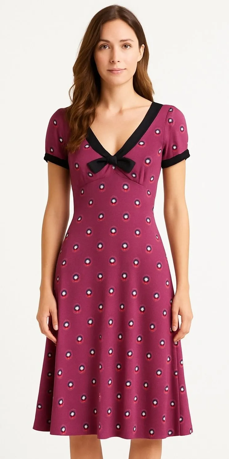 A delightful Unique Vintage x GB collaboration dress featuring a charming clock print. This fit and flare dress showcases a deep V-neckline framed by contrasting black trim and a sweet bow detail at the bust. The dress has a flattering silhouette that flares gently from the waist, complemented by short sleeves with rolled cuffs. Designed with a retro flair and an all-over clock pattern, this dress brings a touch of vintage charm to any wardrobe. Style: Fit & Flare Dress Length: Midi Length Color: Purple Department: Women Sleeve Length: Short Sleeve Pattern: Clock Print Material: Polyester, Spandex Neckline: V-Neck Character: Retro, Vintage, Time Traveler, Clock, Party Girl Fabric Type: Knit Season: Spring, Summer, Fall Measurements: armpit to armpit 14.5 in waist side to side 11 in length 41 in Professional seller, smoke free home and same or next day shipping.