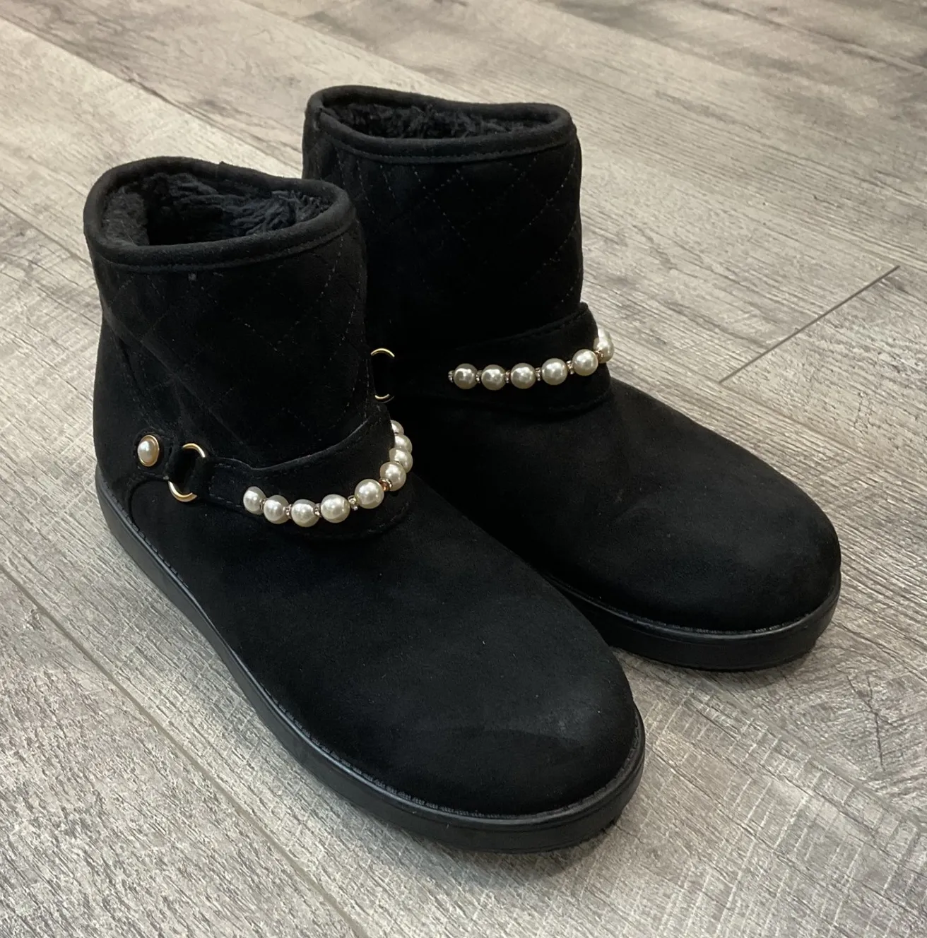 Stylish ankle boots featuring a soft, black faux suede exterior with a unique quilted pattern on the shaft. These boots are adorned with faux pearl embellishments along the ankle, adding a touch of elegance. Further enhancing its design are gold-tone hardware accents, complemented by a cozy, faux fur interior for added warmth and comfort. These boots are set on a durable, flat sole. Gently used condition. Normal wear. Please see all photos for any flaws or conditions. Style: Bootie Department: Women Upper Material: Faux Suede Theme: Contemporary, Retro, Pearlcore Shoe Shaft Style: Ankle Heel Style: Flat Occasion: Casual Lining Material: Faux Fur Insole Material: Synthetic Outsole Material: Rubber Toe Shape: Round Toe Heel Height: Flat Type: Boot Keywords: black ankle boots, faux suede boots, quilted boots, pearl embellished boots, womens boots, winter boots, UNISA boots, size 9.5M, fashion boots, casual boots, ankle booties, black booties, comfortable boots, dressy boots